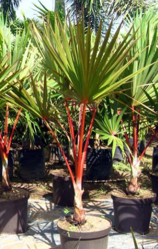 Latania lontaroides (Red Latan Palm) is Small to medium-sized palm with deeply lobed, grey-green leaf-blades, to 1.5m across, with red-purple-flushed bases and leaf-stalks. Greenish white to cream flowers are borne in summer.